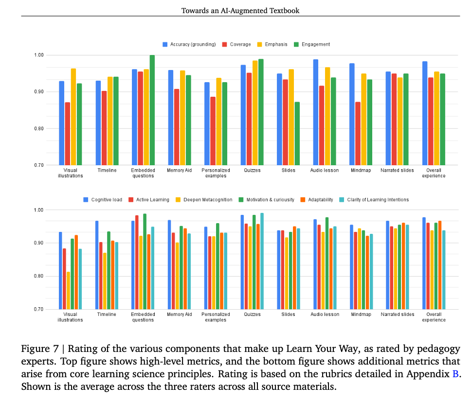 Figure 7은 교육 전문가들이 'Learn Your Way'의 다양한 구성 요소들을 교육학적 기준에 따라 평가한 결과를 보여주는 두 개의 막대그래프입니다. 전문가들은 정확성, 내용 범위, 인지 부하, 동기 부여 등 여러 기준에 따라 각 기능에 대해 '동의(1.0)', '중립/부분 동의(0.5)', '비동의(0.0)'로 점수를 매겼습니다.