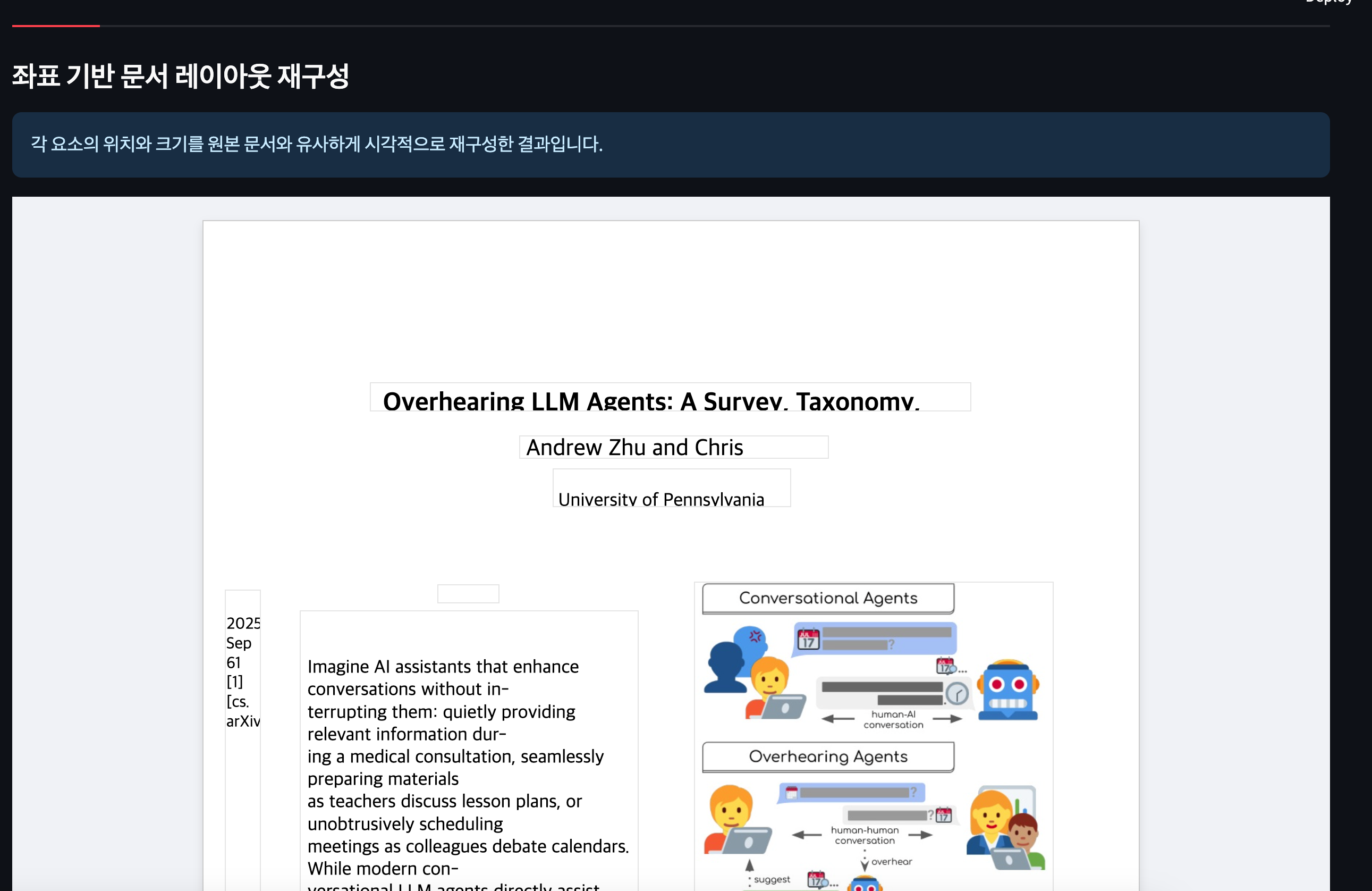 좌표 기반으로 문서 레이아웃을 구성할 수 있고(페이지 렌더링상 좀 깨집니다 ㅠ) HTML 랜더링으로도 확인할 수 있습니다.