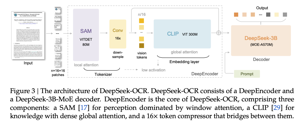 - 최종적으로, 국소적 특징(SAM)과 전역적 맥락(CLIP)이 모두 반영되고 압축된 256개의 비전 토큰이 DeepSeek-3B LLM 디코더로 전달되어 최종 텍스트를 생성합니다. 이처럼 [SAM(로컬 처리) → Conv(압축) → CLIP(전역 처리)]로 이어지는 3단계 직렬 구조는, 고해상도 이미지의 세부 정보를 잃지 않으면서도 계산 비용을 획기적으로 절감하는 최적화 방법이라고 볼 수 있습니다.
