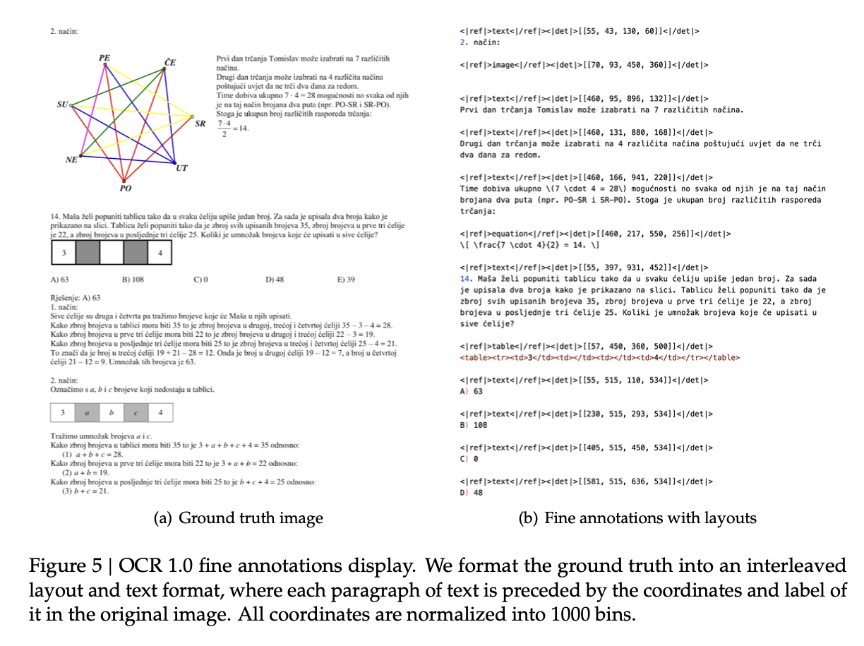 이 모델의 궁극적인 목표는 단순한 문자 인식(Traditional OCR)을 넘어섭니다. Figure 5는 모델이 학습하는 '정교한 주석(Fine annotations)' 데이터의 형식을 보여주며, 이는 모델의 학습 목표가 무엇인지를 명확히 드러냅니다. 모델은 단순히 텍스트의 내용을 예측하는 것이 아니라, 해당 내용의 의미론적 종류(예: table, equation)와 이미지 내 정확한 위치 좌표([[...]])까지 함께 학습합니다.