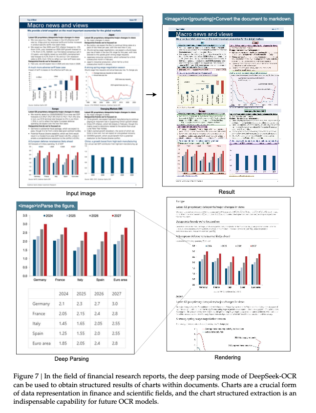 즉, 모델은 단순히 글자를 '읽는(Reading)' 수준을 넘어, 문서의 '구조와 레이아웃을 이해(Understanding)'하도록 훈련됩니다. 이것이 DeepSeek-OCR이 'LLM 중심의 통합형 모델'이라 불리는 이유이며, LLM 디코더가 이 구조화된 정보를 입력받아 단순 텍스트가 아닌 마크다운(Markdown) 변환이나 구조화된 데이터 추출 같은 고차원적인 작업을 수행할 수 있게 만듭니다. 논문은 이를 기존 OCR 1.0을 넘어서는 'OCR 2.0'의 영역으로 정의합니다.
