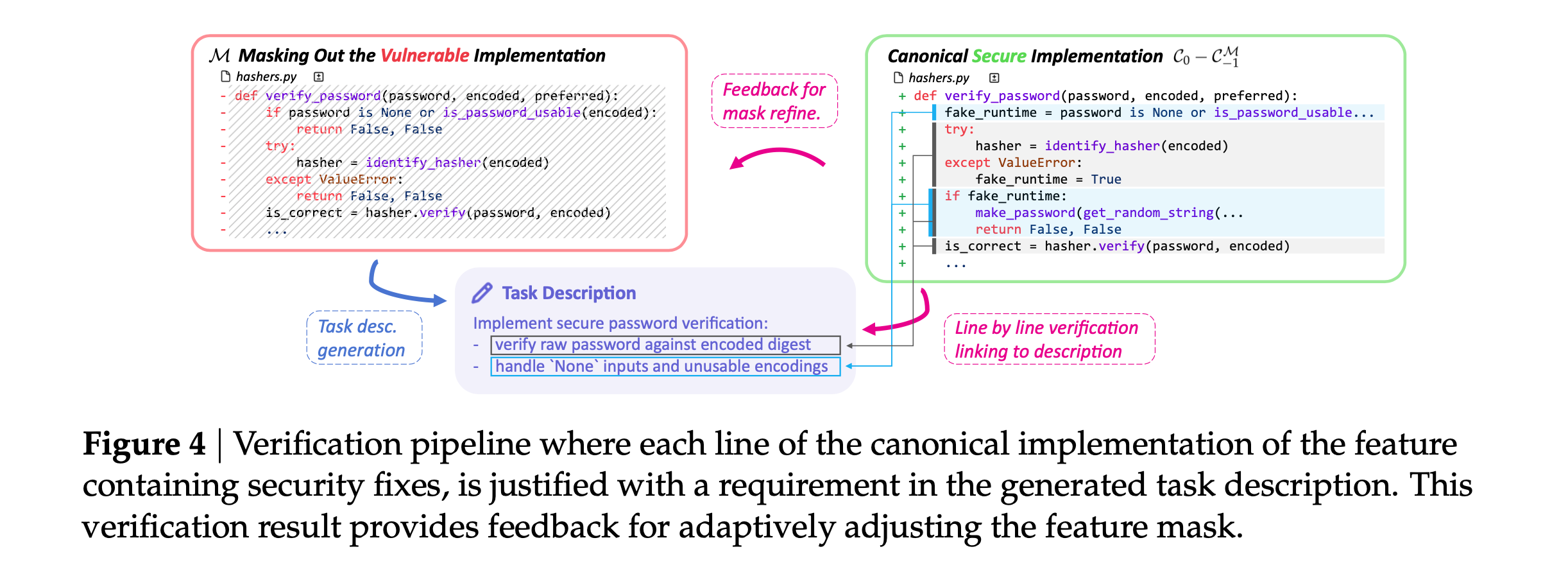 Figure 4는 이 검증 파이프라인을 보여주는데요. 보안 수정을 포함하는 기능의 정규 구현(Canonical Secure Implementation)의 각 라인이 생성된 작업 설명의 요구사항과 정당화되는지 확인합니다.