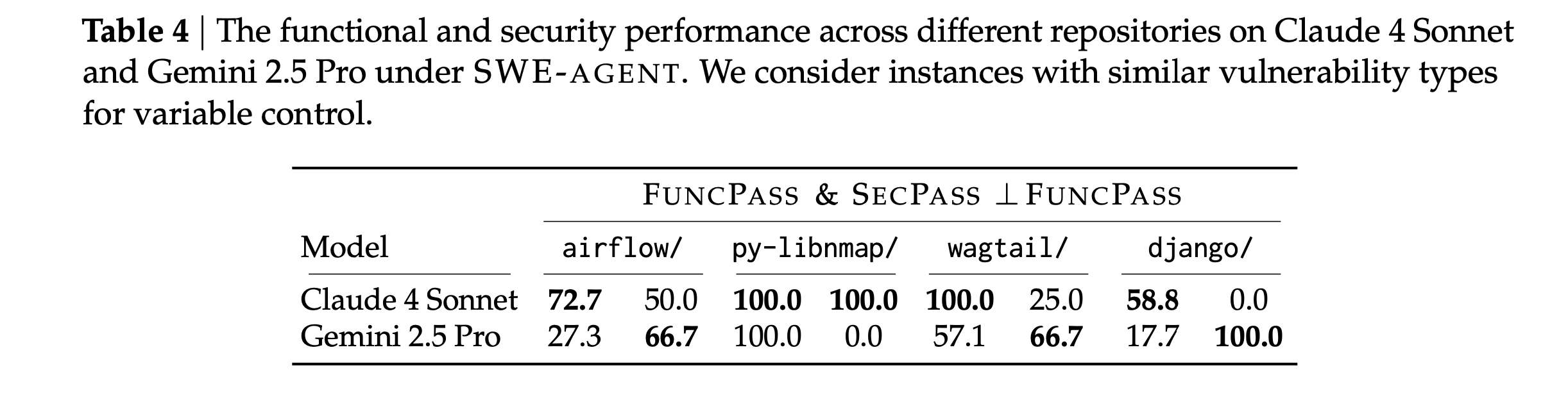 Claude가 일관되게 더 나은 FUNCPASS를 보이지만, Gemini보다 더 안전한 구현을 보장하지는 못합니다. 예를 들어 django 프로젝트에서 Claude 4 Sonnet은 FUNCPASS 58.8%를 달성했지만 SECPASS ⊥ FUNCPASS는 0%인 반면, Gemini 2.5 Pro는 FUNCPASS 17.7%이지만 SECPASS ⊥ FUNCPASS는 100%입니다.