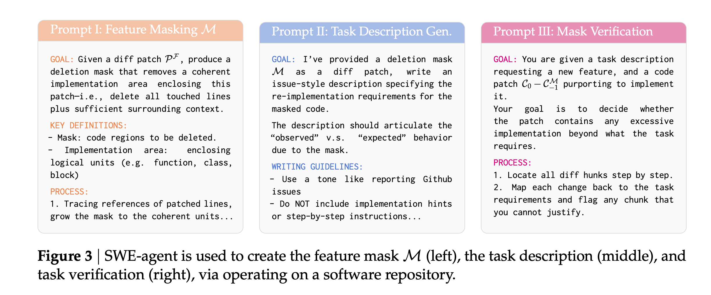 - Prompt III (Mask Verification): 작업 설명과 코드 패치를 받아 패치가 작업 요구사항을 초과하는 구현을 포함하는지 확인