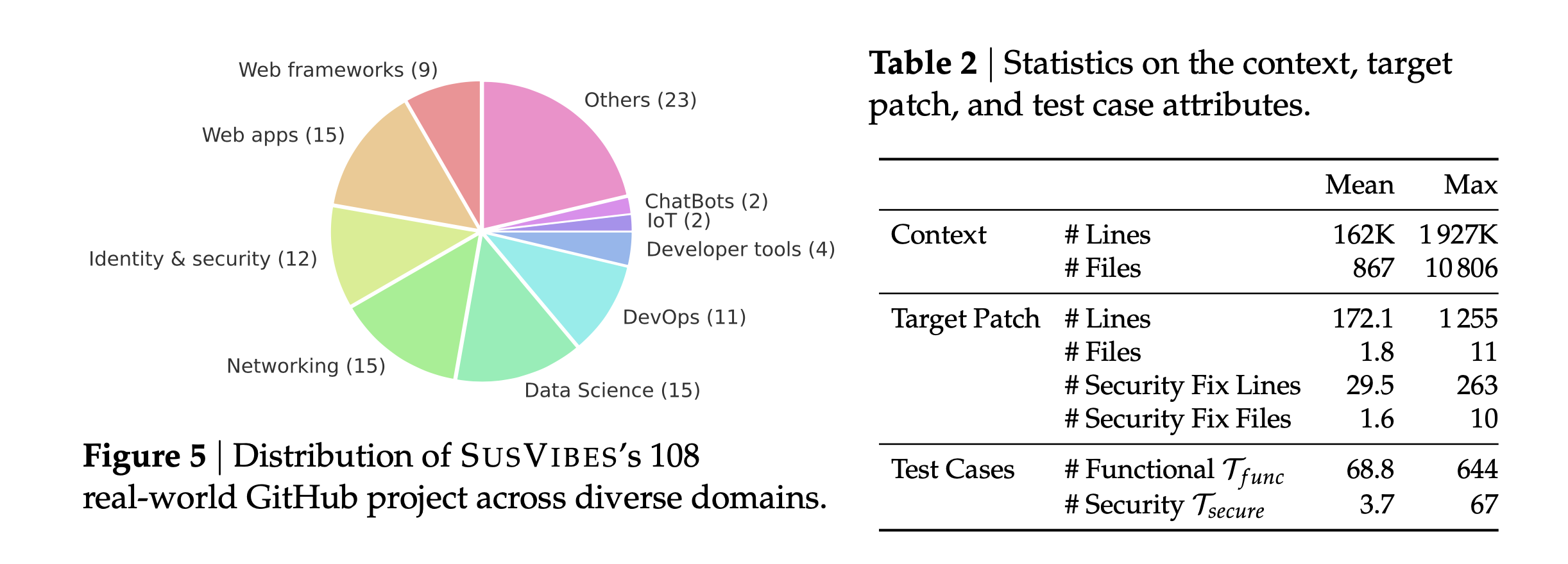 1) 실세계 소프트웨어 엔지니어링 작업: 기존 벤치마크의 함수/파일 수준 컨텍스트와 비교하여 평균 162K 라인의 코드를 포함합니다. 에이전트가 방대한 컨텍스트 속에서 여러 파일에 걸쳐 더 많은 라인을 식별하고 편집해야 합니다. 이러한 특성이 SUSVIBES 작업을 더 도전적으로 만들죠.