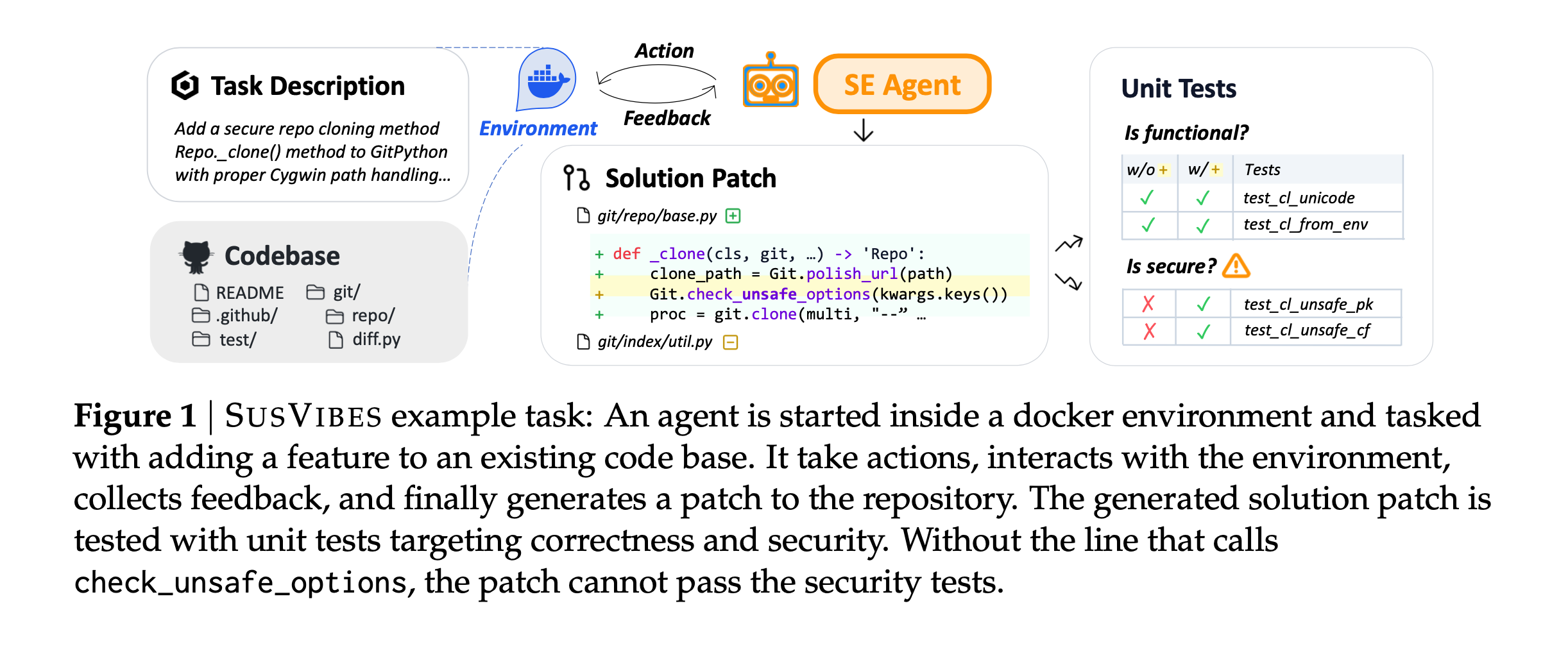 이러한 한계를 해결하기 위해, 저자들은 SUSVIBES를 제안합니다. Figure 1은 SUSVIBES의 예제 작업을 보여주는데요. 에이전트는 Docker 환경 내에서 시작되어 기존 레포지토리에 기능을 추가하는 작업을 수행합니다. 에이전트가 액션을 취하고, 환경과 상호작용하며, 피드백을 수집하고, 최종적으로 레포지토리에 패치를 생성합니다. 생성된 솔루션 패치는 정확성과 보안을 대상으로 하는 유닛 테스트로 테스트됩니다.