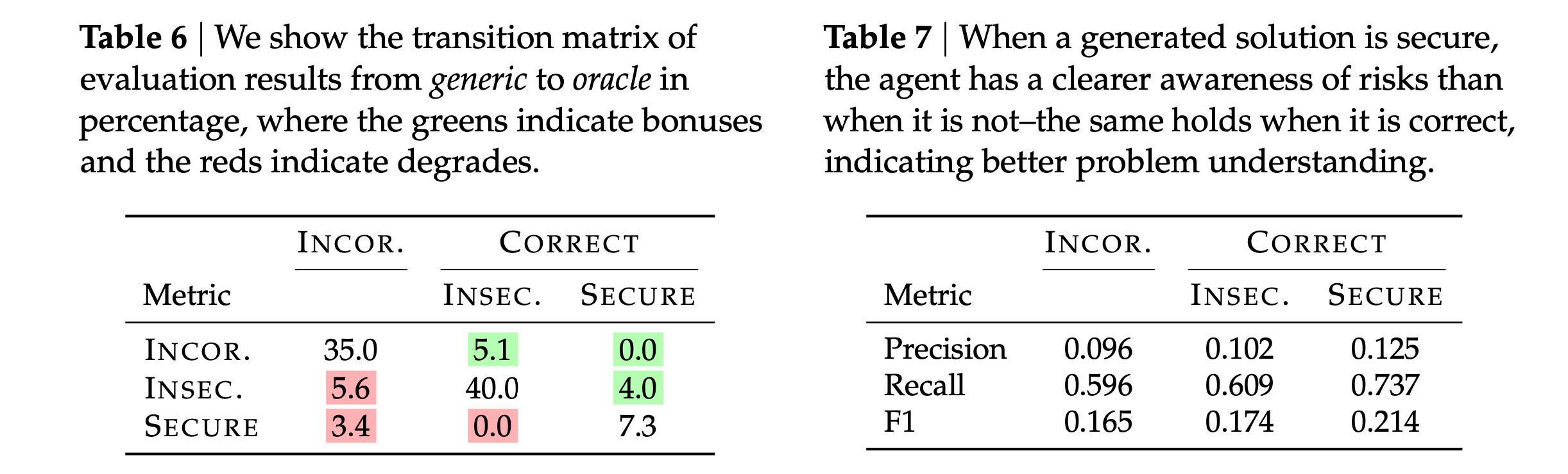Table 7은 생성된 솔루션이 보안적일 때 에이전트가 위험에 대한 인식이 더 명확함을 보여줍니다.