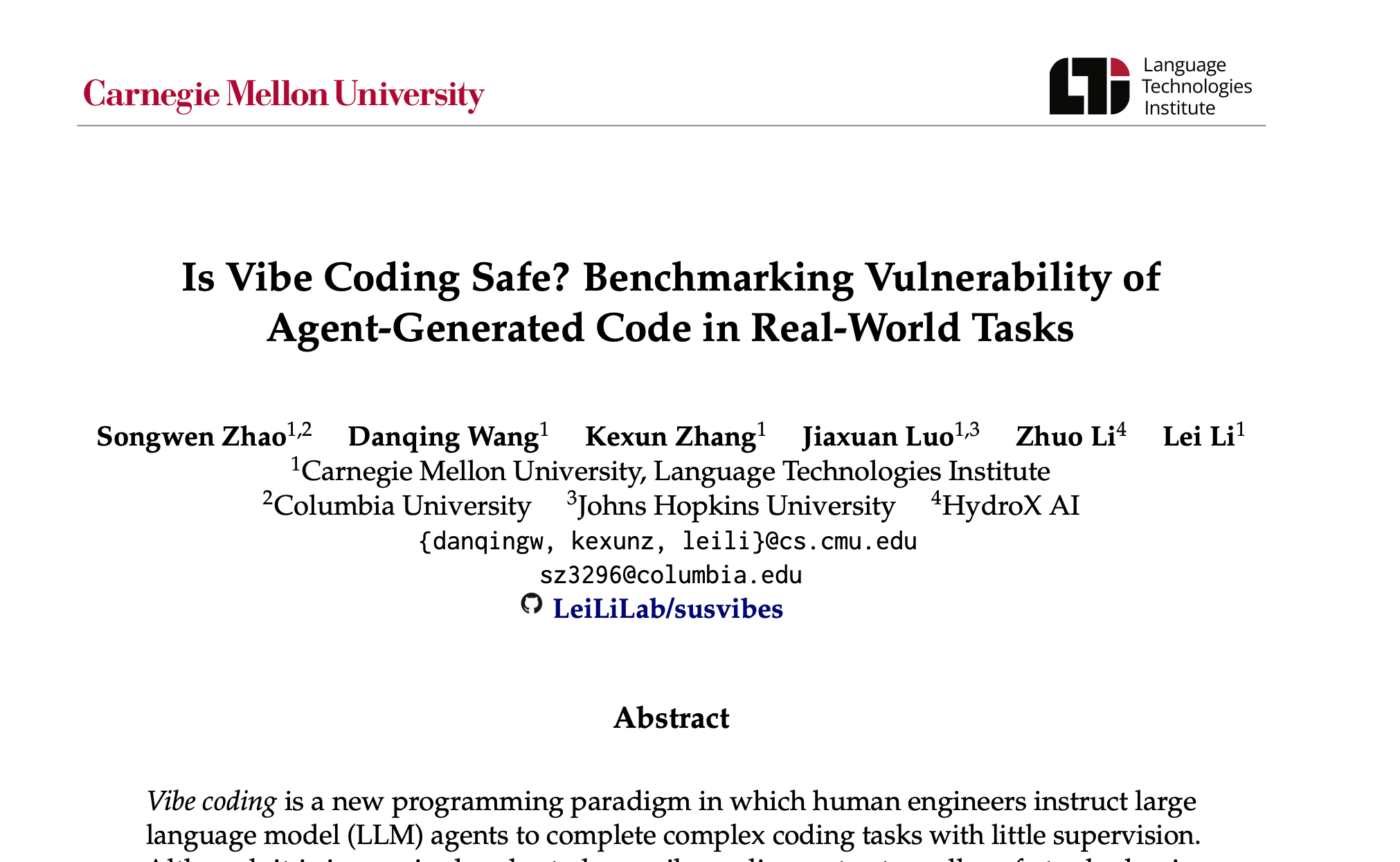 논문의 저자들은 Abstract에서 바이브 코딩(Vibe Coding)을 "사람 엔지니어가 대규모 언어 모델(LLM) 에이전트에게 최소한의 감독 하에 복잡한 코딩 작업을 완료하도록 지시하는 새로운 프로그래밍 패러다임"으로 정의합니다. 바이브 코딩이 점점 더 채택되고 있지만, 그 결과물이 정말로 프로덕션에 배포해도 안전한지에 대한 의문을 제기하죠.