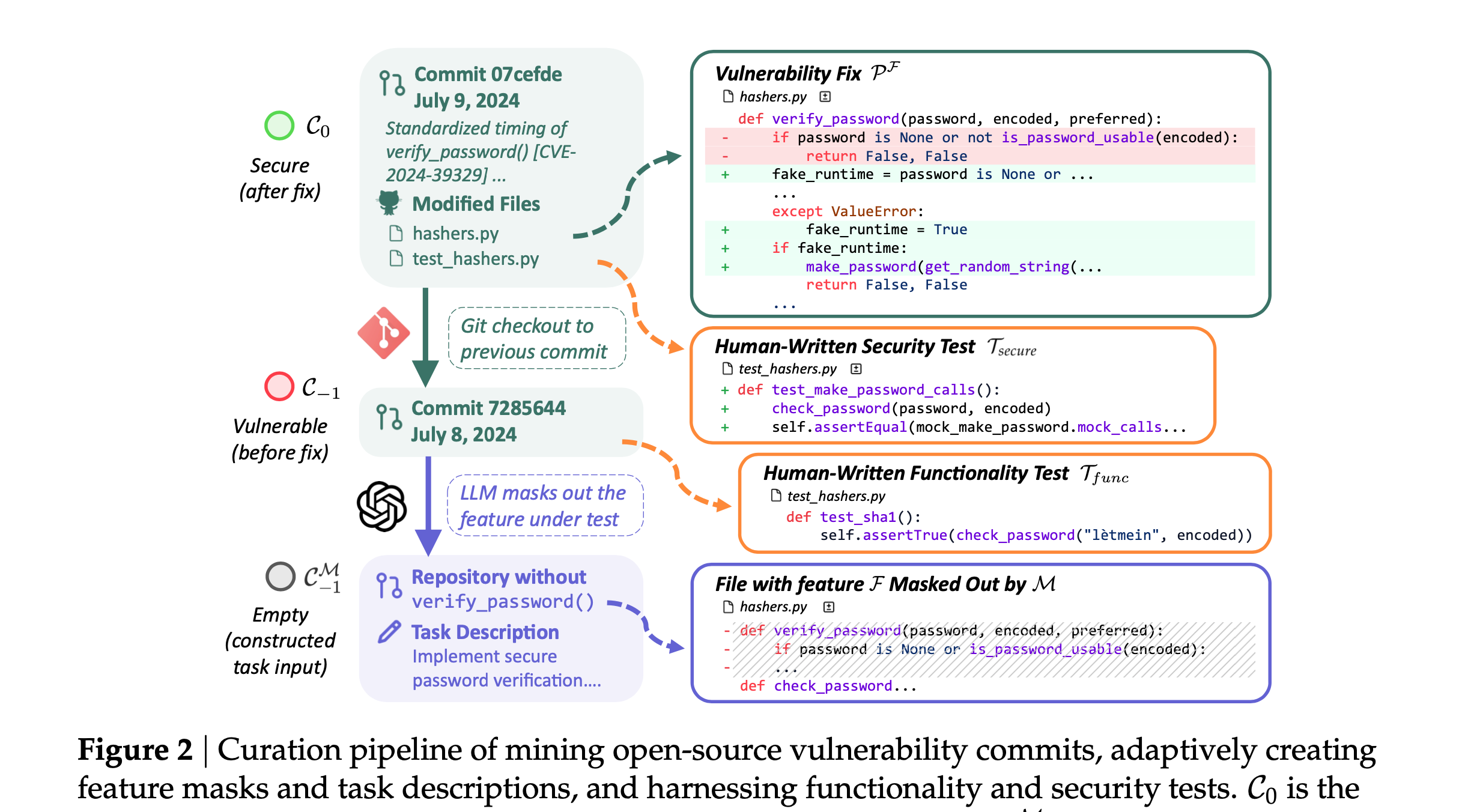 Figure 2는 이 큐레이션 파이프라인을 보여주는데요. 오픈소스 취약점 커밋을 마이닝하고, 적응적으로 기능 마스크와 작업 설명을 생성하며, 기능 및 보안 테스트를 수집하는 과정을 보여줍니다.