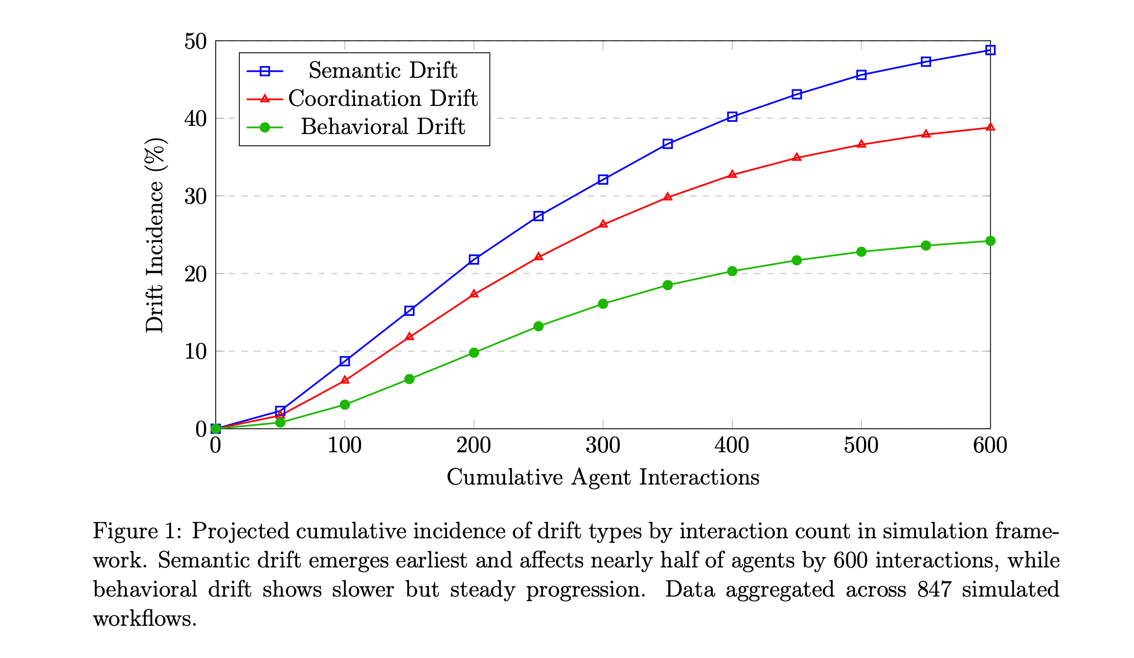3) 도메인 변이 (Domain Variation): 시뮬레이션된 드리프트 발생률은 도메인에 따라 상당히 달랐습니다. 금융 분석 시스템이 가장 높은 취약성을 보였고(500개 상호작용까지 53.2%), 컴플라이언스 모니터링(39.7%)과 기업 자동화(31.8%)가 뒤를 이었습니다. 이는 작업 모호성을 반영하는 것으로 보입니다. 금융 분석은 해석의 자유도가 높고 모호한 작업이므로 에이전트가 제멋대로 해석할 여지가 많았던 것이죠. 반면, 데이터베이스 작업과 같이 구조화된 작업은 상대적으로 드리프트에 덜 취약했습니다.