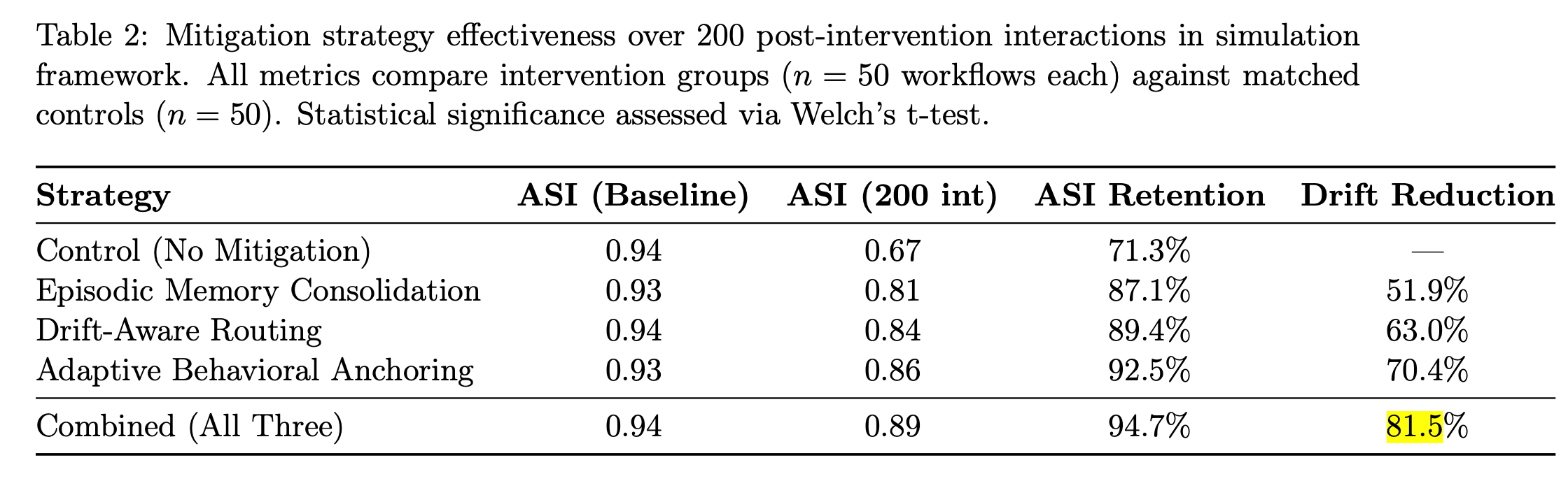 세 가지 전략 모두 대조군보다 유의하게 우수했으며(각각 p < 0.001), 적응적 행동 앵커링이 가장 큰 단일 전략 효과(70.4% 드리프트 감소)를 보였습니다. 세 가지 전략을 모두 결합하면 81.5% 드리프트 감소를 달성했으며, 이는 보완적인 작용 메커니즘을 시사합니다.