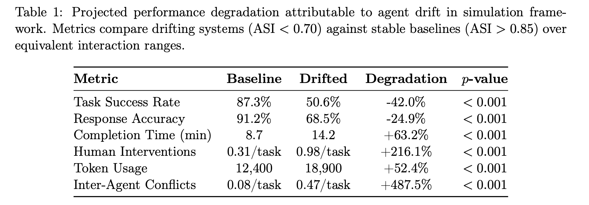 드리프트 시스템(ASI < 0.70)과 안정적 기준선(ASI > 0.85)을 동등한 상호작용 범위에서 비교했을 때, 결과는 아래 표와 같습니다.