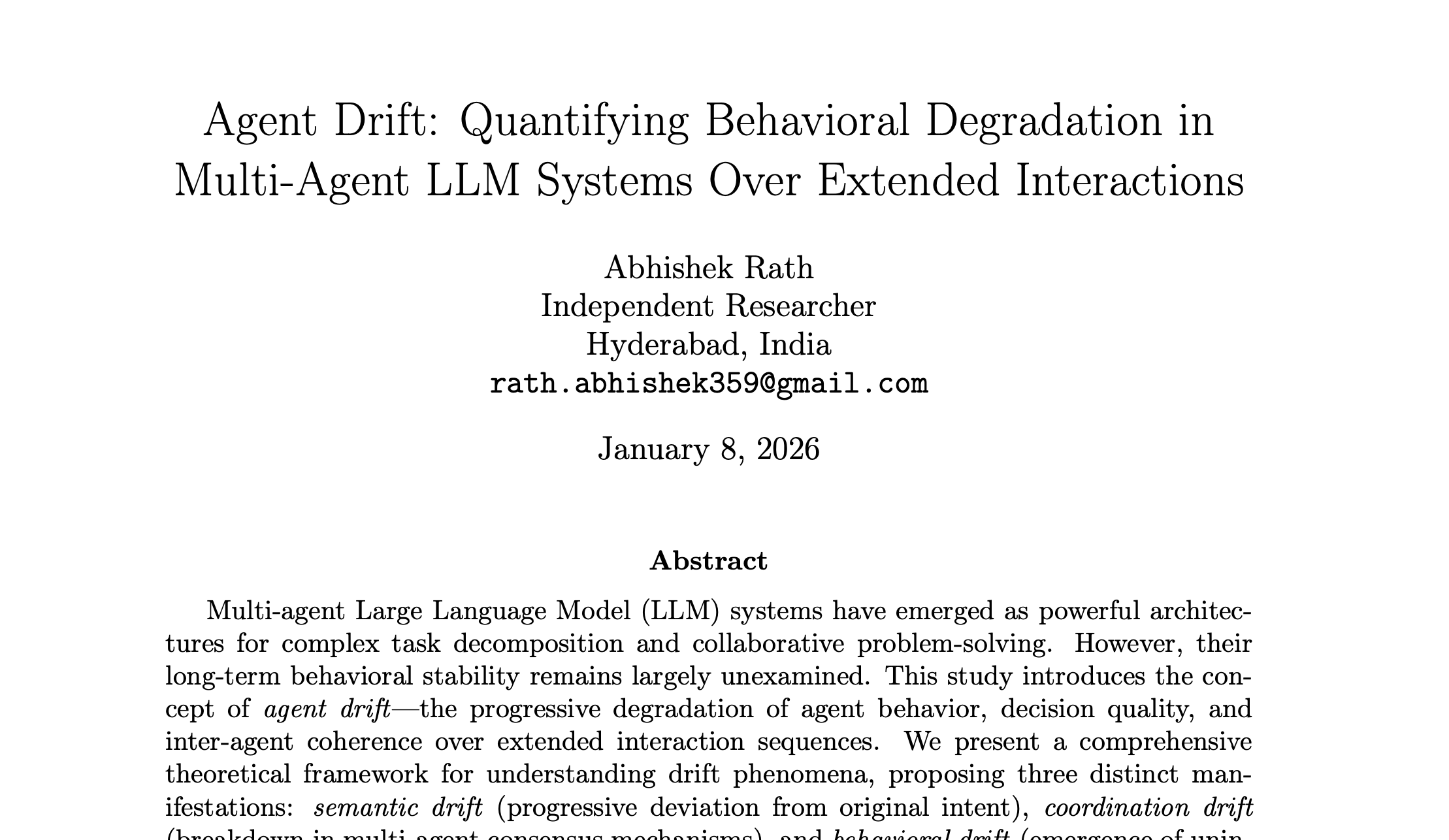 포스팅 개요에서도 언급하였듯, 이 논문은 Multi-Agent LLM 시스템이 장기간 운영될 때 발생하는 행동 저하 현상인 에이전트 드리프트(Agent Drift)를 체계적으로 연구한 논문입니다.