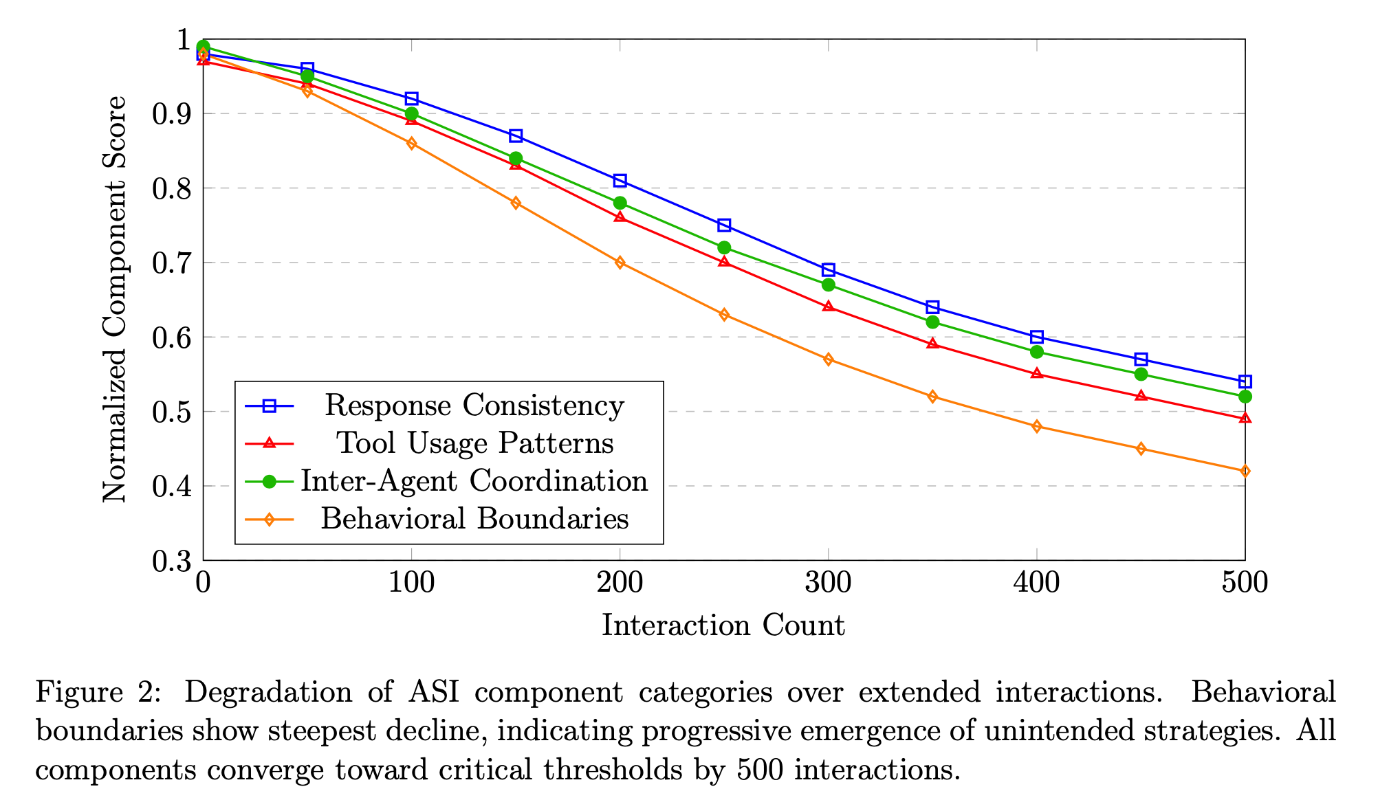 네 가지 ASI 구성 요소 범주 모두 처음 300개 상호작용을 통해 대략 선형적으로 하락한 후 가속화된 저하를 보였습니다. 이는 축적된 드리프트가 자기 강화를 시작하는 임계 임계값(critical threshold)이 존재함을 시사합니다.