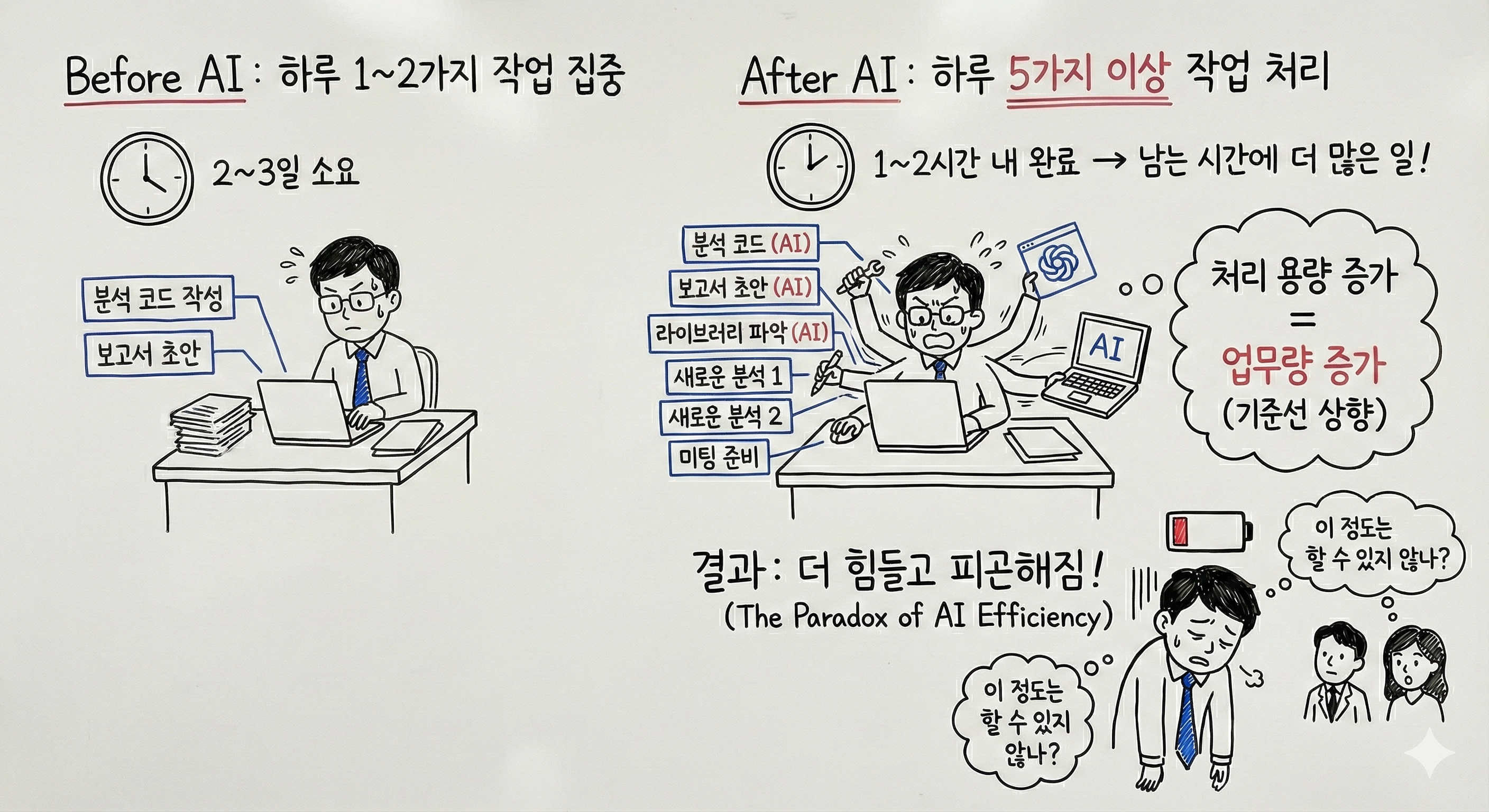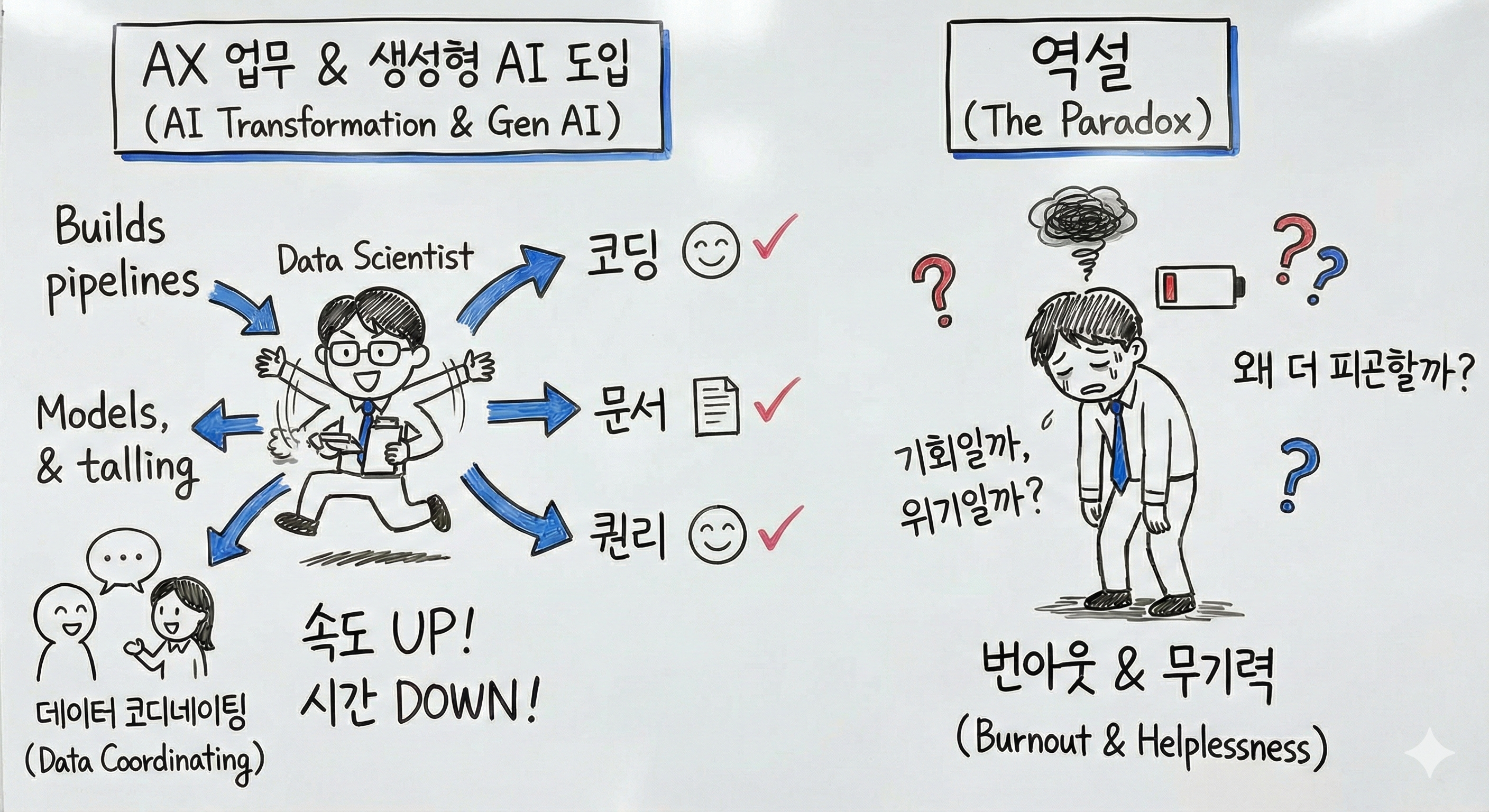 나는 지금 데이터사이언티스트 직책을 담당하고 있다. 직책만 데싸이고, 사실상 PM의 역할을 수행하고 있다. 현업 실무자 분들과 커뮤니케이션하며 업무 효율화 향상을 위한 AI 시스템 개발, AI 문화 확산 등 흔히 말하는 AX(AI Transformation) 업무를 하고 있다. 생성형 AI가 업무 전반에 들어온 이후, 확실히 개발 작업의 속도는 빨라졌다. 코드를 짜는 시간, 문서를 정리하는 시간, 쿼리를 작성하는 시간. 체감할 수 있을 정도로 줄었다. 그런데 이상한 일이 벌어졌다. 하루가 끝나면 예전보다 훨씬 더 피곤했다. 어떤 날은 번아웃처럼 찾아왔고, 어떤 날은 원인을 알 수 없는 무기력함으로 나타났다.