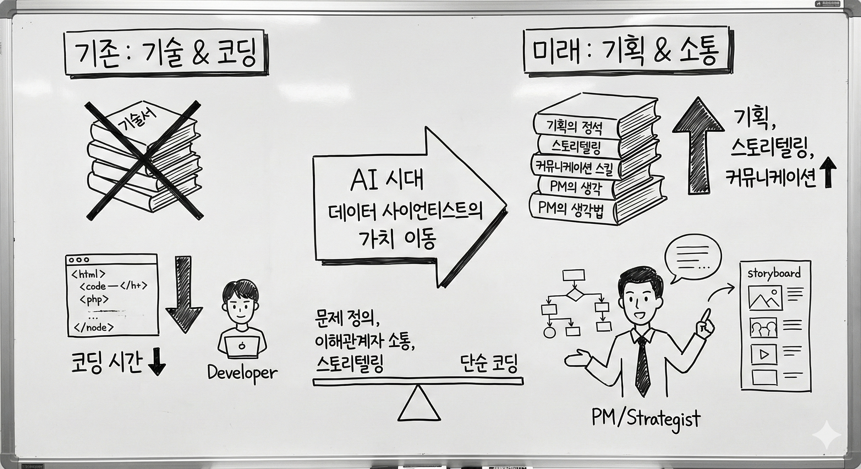 또한, 책을 읽는 시간을 늘렸다. 기술서만이 아니다. 사실 이제 기술서는 되도록 안보려고 노력하고 있다. 그 대신 기획, 스토리텔링, 커뮤니케이션에 대한 책들을 읽고 있다. 이유가 있다. AI 시대에 데이터사이언티스트의 가치는 코드를 빠르게 짜는 데 있지 않다고 생각하게 됐기 때문이다. 문제를 정의하고, 이해관계자와 소통하고, 서비스를 사용하는 사람들의 스토리텔링을 만들어내는 능력 그쪽에 무게를 두기 시작했다. 개발자로서의 모습을 조금씩 내려놓고, 기획과 PM의 관점, 스토리텔링과 시나리오 설계, 커뮤니케이션에 집중하려고 한다. 이전 회사에서부터 지금까지 2~3년째 이 방향으로 가고 있다. 솔직히 잘 안 된다. 그래도 꾸준히 하고 있다.