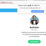 파이썬에서 사용할 수 있는 다양한 API 중 텔레그램을 이용한 API가 있습니다.이 API를 이용하면 텔레그램을 이용해서 알림을 설정할 수 있구요, 메세지를 전달 받을 수 있습니다.아니면 내가 어떤 메세지를 주면 그 메세지에 따라 어떤 함수를 실행할 수도 있구요 오늘은 그 파이썬과 텔레그램 API 연동을 살펴보겠습니다.환경은 윈도우이구요, 파이썬 3.6버전입니다 먼저 해당 사이트를 들어가야합니다(텔레그램 PC 버전이 설치되어 있다고 가정합니다)https://telegram.me/botfather 사이트로 들어가면 아래처럼 나오게 됩니다 자 여기서 SEND MESSAGE를 눌러서 시작합니다!시작하게 되면 아래처럼 나오게 될 것입니다 저기저 START를 눌러 시작합니다!진행해볼까요 시작하면 이런 화면이 나올..